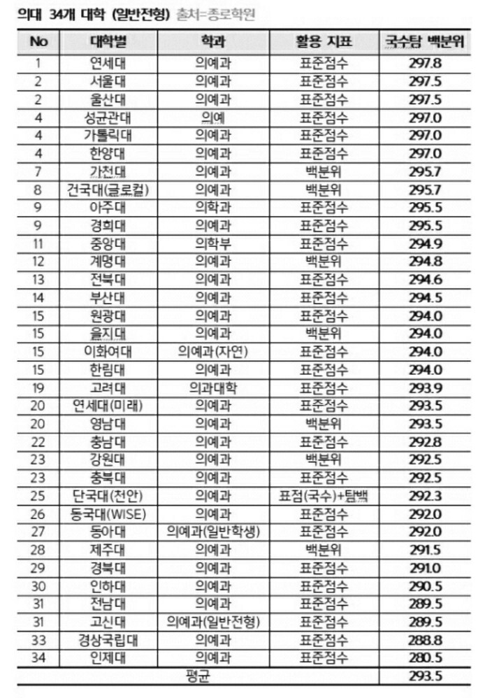 의대 34대 대학 국수탐 백분위 기준 순위 (출처: 종로학원)