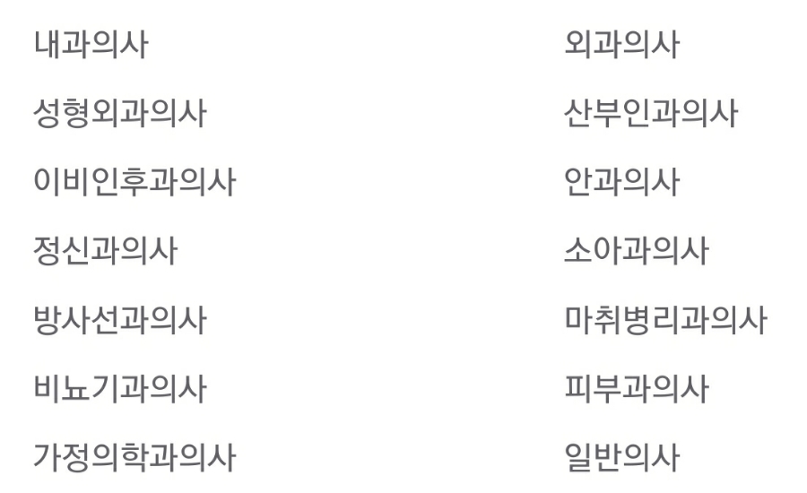 내과 외과 성형외과 산부인과 이비인후과 안과 정신과 소아과 방사선과 마취병리과 비뇨기과 피부과 가정의학과 등