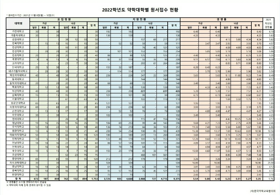 2022학년도(2021년 접수) 약대 입학 경쟁률 (가군/나군 구분, 일반/특별 구분)